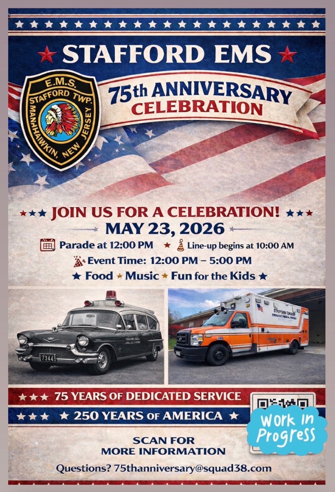 Stafford Township Emergency Medical Services (Squad 38) has proudly served the community since 1951, originally formed as the Stafford Township First Aid Squad. Our mission is to provide exceptional emergency medical care to the residents and visitors of Stafford Township and the surrounding areas. Responsible for a 47-square-mile service area, with approximately 30,000 residents and over 100,000 visitors annually, STEMS currently operates as a 100% VOLUNTEER organization. Averaging over 4,000 calls for service per year, we are responsible for providing coverage 24 hours a day, 7 days a week.